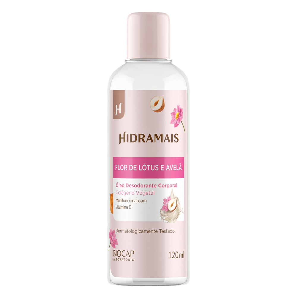 O Óleo Desodorante Flor de Lotus e Avelã da Hidramais desodoriza, hidrata e deixa a pele com um perfume misterioso e sedutor. O Óleo da Hidramais Tratamento Profissional, deixa sua pele com um cuidado mais especial a qualquer hora do seu dia. Possui formulação enriquecida com colágeno e óleos vegetais, que potencializam a hidratação. Fragrância: Flor de Lotus e Avelã: Misteriosa e Sedutora