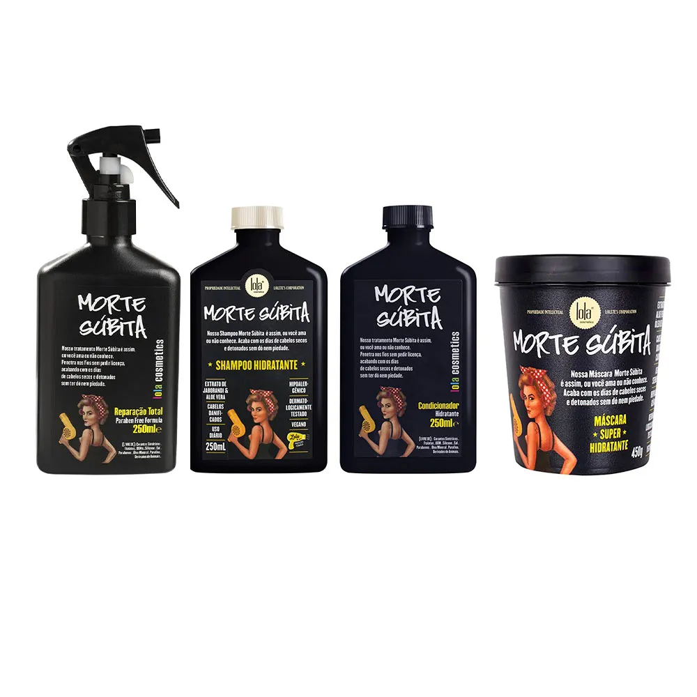 O Kit Morte Súbita da Lola From Rio é um conjunto poderoso de cuidados capilares composto por shampoo esfoliante, condicionador nutritivo, máscara hidratante intensa e spray reparador total. Cada produto tem sua função específica: o shampoo realiza um detox profundo no couro cabeludo removendo impurezas; o condicionador proporciona nutrição pós-lavagem; a máscara atua na recuperação intensa dos fios fragilizados; enquanto o spray repara instantaneamente danos visíveis como pontas duplas e frizz.