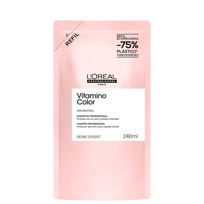 Shampoo para cabelos coloridos. L’Oréal Professionnel Serie Expert Vitamino Color Resveratrol realiza uma limpeza delicada que não agride e mantém o brilho da cor.