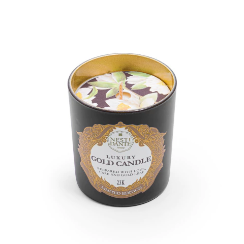 Vela Luxury Gold traz o luxo atemporal da folha de ouro 23k combinada com a elegância do Íris Nobre, flor símbolo de Florença. Vegana, biodegradável e com pavio de algodão puro, proporciona uma experiência sensorial refinada e envolvente. Um toque de luxo e sofisticação ao seu ambiente.